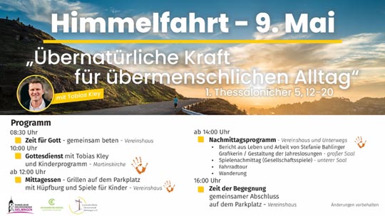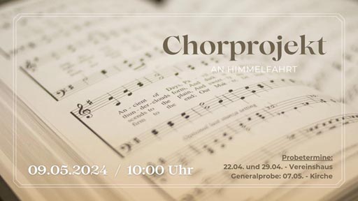 Chorprojekt für Himmelfahrt Herzliche Einladung zum Projektchor an Himmelfahrt am 9. Mai um 10 Uhr. Die Proben hierfür sind am 29. April, um 20 Uhr im Vereinshaus und am 7. Mai um 20 Uhr in der Kirche. Bei Fragen gerne bei Christin oder Magdalene Doll melden.